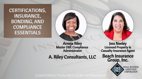 SBAC Construction Industry Workshop: Certification, Insurance, Bonding, and Compliance Essentials February 11, 2025 @ 4:00 pm - 5:00 pm Construction Industry Workshop Series Arneja Riley, MWBE Solutions Expert A. Riley Consultants and Jess Neeley, Licensed Property & Casualty... View Details