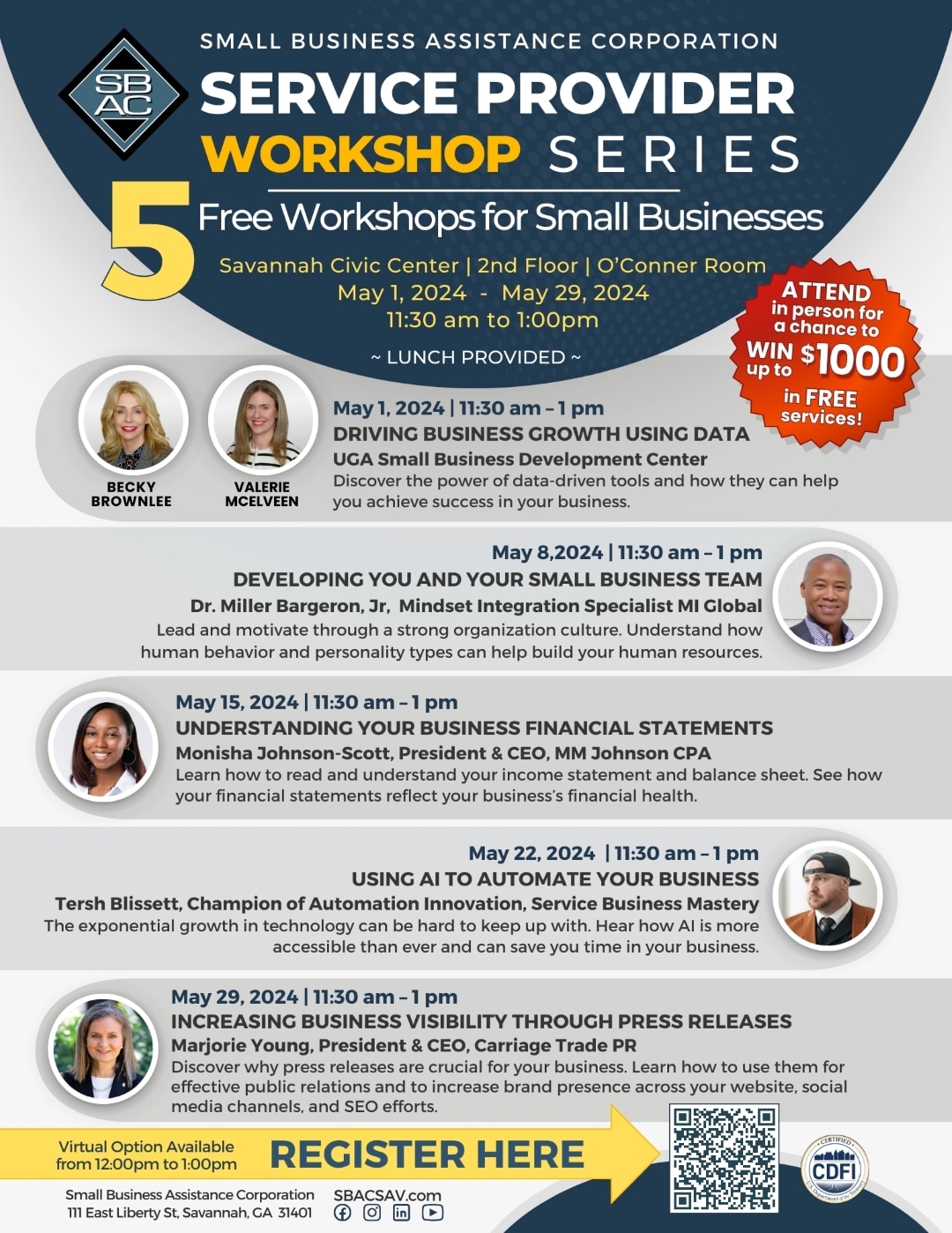 Savannah, GA – The Small Business Assistance Corporation (SBAC) recently wrapped up its 2024 Service Provider Workshop Series, which ran from May 1 through May 29. This initiative aimed to connect local small businesses with leading organizations, providing them with expert advice and practical knowledge to help elevate their operations.