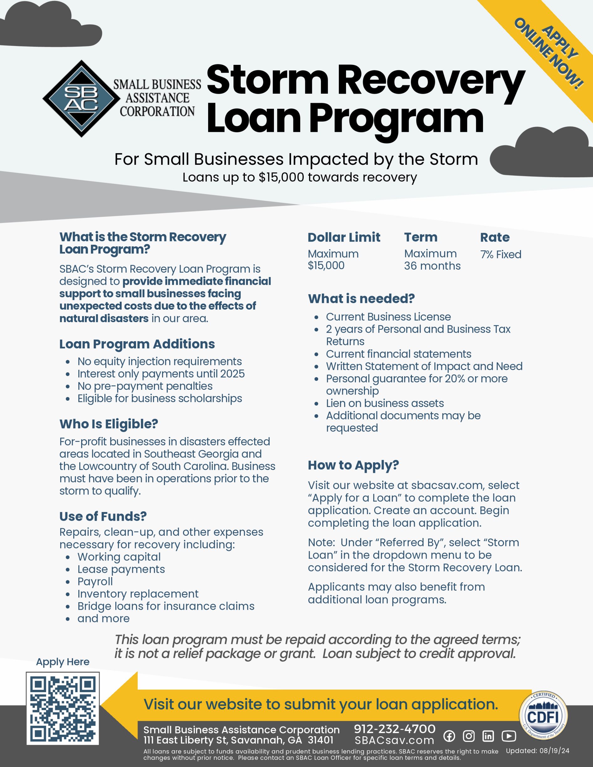 SAVANNAH, GA – August 19, 2024 – In response to the catastrophic flooding caused by Tropical Storm Debby across Southeast Georgia and South Carolina’s Lowcountry, the Small Business Assistance Corporation (SBAC) is announcing the launch of its Storm Recovery Loan Program. This loan program provides federal funds for financial relief to local small businesses affected by the flooding.